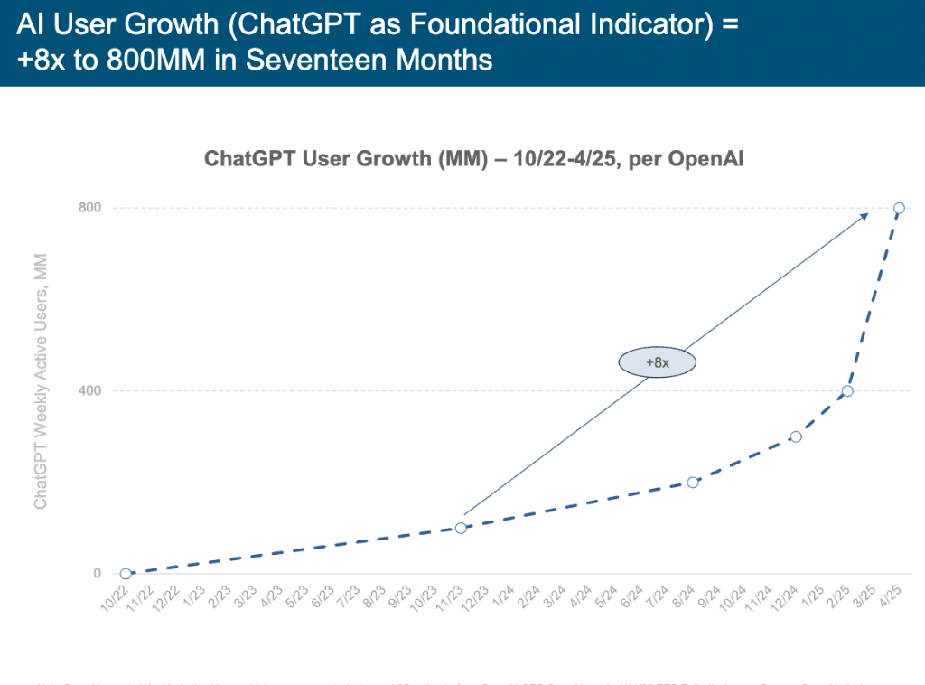DeepSeek (中国)和 Grok 等新兴力量正敏捷兴起,其使用内利用时间两年内翻倍,模子锻炼成本虽高达10亿美元,ChatGPT曾正在 17 个月内狂揽8亿用户,